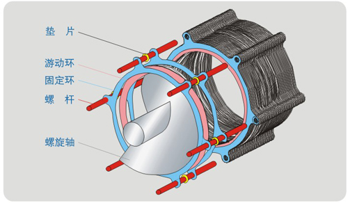 疊螺式污泥脫水機(jī)主體有多重固定環(huán)、游動環(huán)和螺旋過濾部構(gòu)成,有機(jī)地結(jié)合了過濾濃縮技術(shù)和壓榨技術(shù),將污泥的濃縮和壓榨脫水工作在一筒內(nèi)完成;在濃縮腔內(nèi),它利用定、動疊片間的相對游動,使濾液快速排出,永不堵塞;在脫水腔內(nèi)利用螺旋腔室內(nèi)體積的不斷收縮,增強(qiáng)內(nèi)壓及背壓板的調(diào)壓機(jī)理,以獨(dú)特微妙的的濾體模式取代了傳統(tǒng)的濾布和離心的過濾方式,其先進(jìn)固液分離和自清洗技術(shù)將開創(chuàng)污泥脫水的新時代。